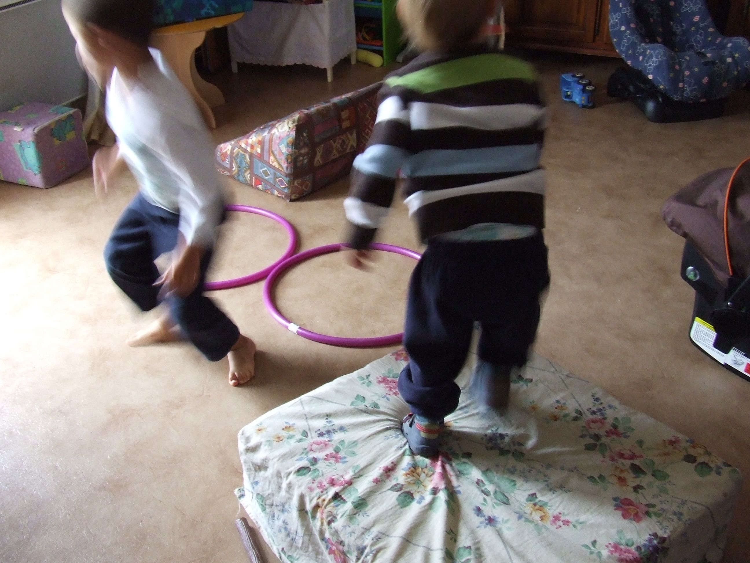 Cerceaux, coussins formes triangulaires, cube de mousse, tout est bon pour faire de la gym, dans le salon. Il faut bien bouger, malgré se temps d’automne en plein mois de juillet.